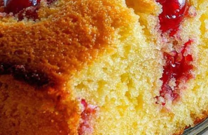 - Pour half of the batter into the prepared tin. Add a layer of cherries, then top with the remaining batter. Place a few more cherries on top (they will sink a little as it bakes).