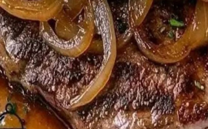 2. Spoon creamy mashed potatoes onto a plate, top with steak slices, and pile caramelized onions on top.