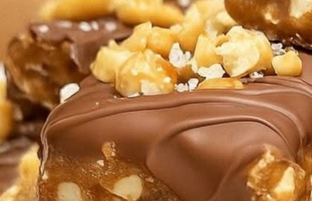 ✨ Result: Soft, chewy caramel packed with peanuts, covered in smooth chocolate, and topped with a salty crunch!
