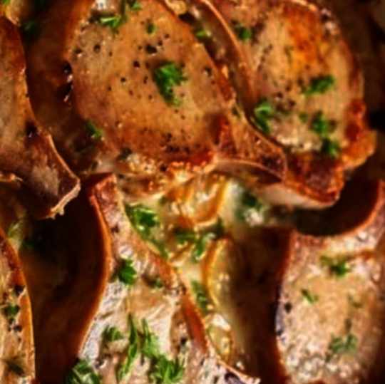 Brown & Layer: On a skillet, brown the pork chops after seasoning them. Once done, position them atop the potato-onion layer.