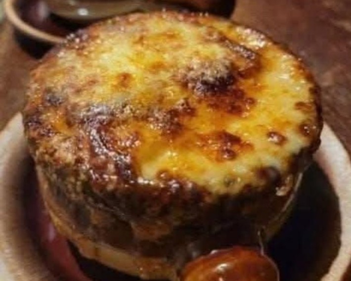 A comforting, indulgent classic. This slow-cooked onion soup is rich in flavor, topped with melted cheese and a golden, crispy crust. Perfect for cozy evenings or a special treat.