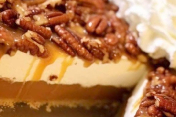 For the topping, melt butter with brown sugar, then stir in cream and vanilla. Mix in pecans and spoon over the cheesecake.
