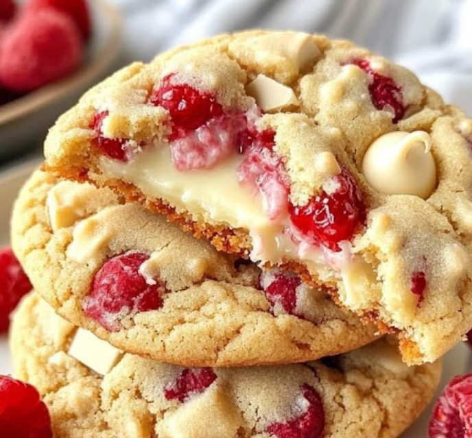 The contrast of flavors and textures makes these cookies an irresistible treat. Perfect for special occasions, holiday baking, or simply as an indulgent snack, these cookies bring together the best of both sweet and tart in every bite. The addition of white chocolate enhances the richness, while the raspberries add a refreshing burst of flavor, making this cookie a truly unique and satisfying dessert.