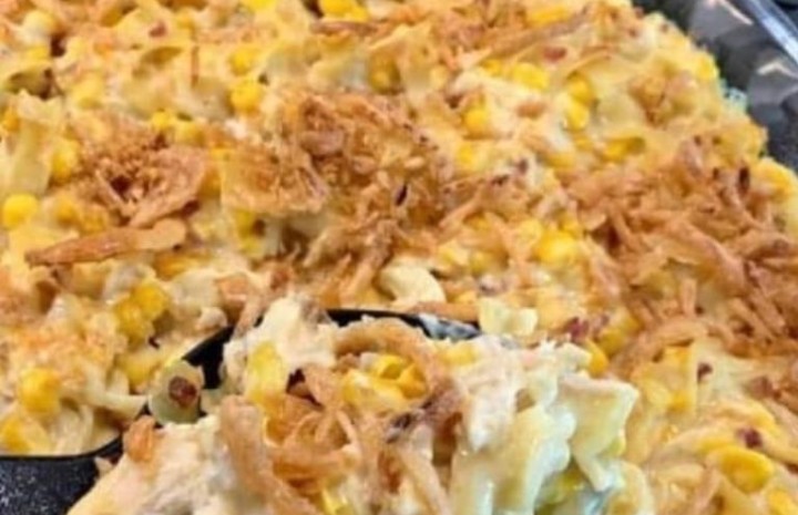 In a medium bowl, mix the cooked egg noodles, shredded chicken, corn, milk, cream of chicken soup, onion, garlic, cheese (add extra if you like it extra cheesy!) bacon, and add salt and pepper to taste.